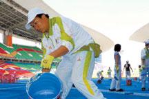 A crowd of volunteers are brushing the ground to increase vision impact. As the opening ceremony will be held on the 12th, the volunteers are giving their all to ensure that people attending will get the best impressions of the event. Thousands of meters of blind roads are away from busy areas, and ramps have been added inside and outside the venues. The non-barrier seats have been increased from 100 to 350 and there are special seats for the athletes. They can watch the performance of the opening ceremony. In addition, non-barrier restrooms are also ready. Built in 2001, the Olympic Sport Center has held the 9th National Games, as well as some other sport events.