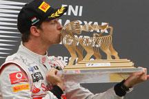 Jenson Button of Britain kisses the trophy after he won theHungarian Formula one Grand Prix at the hungaroring circuit outside Budapest, Hungary, Sunday, July 31, 2011.