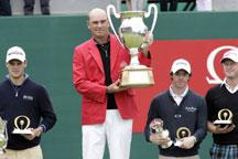 Thomas Bjorn of Denmark holds the winner's trophy at the European Masters in