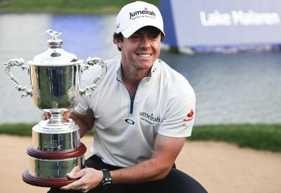 Rory McIlroy of Northern Ireland poses for photos with his trophy after winning the